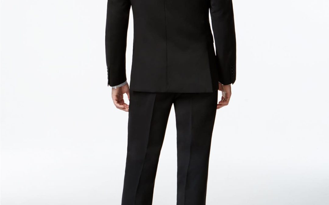 This wool modern fit suit by Calvin Klein has a light gray woven pattern and pick-stitched details that are subtle and sophisticated. A touch of stretch gives it an ideal and comfortable fit.